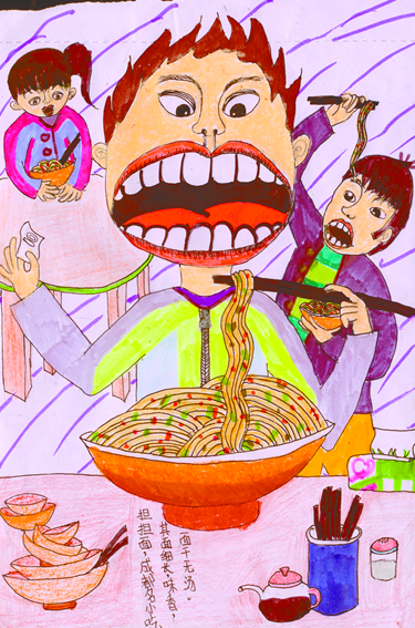 勾怡欣指著自己創(chuàng)作的繪畫《擔擔面》告訴記者,幾天前參加完輔導班回家時路過一家面館,看到里面很多叔叔阿姨正在吃擔擔面,當時便想擔擔面是成都的地道美食,何不把這個場景給畫下來呢?回家后,她便展開畫紙畫下了這幅《擔擔面》。