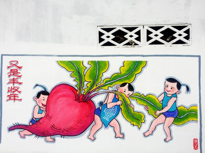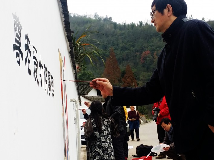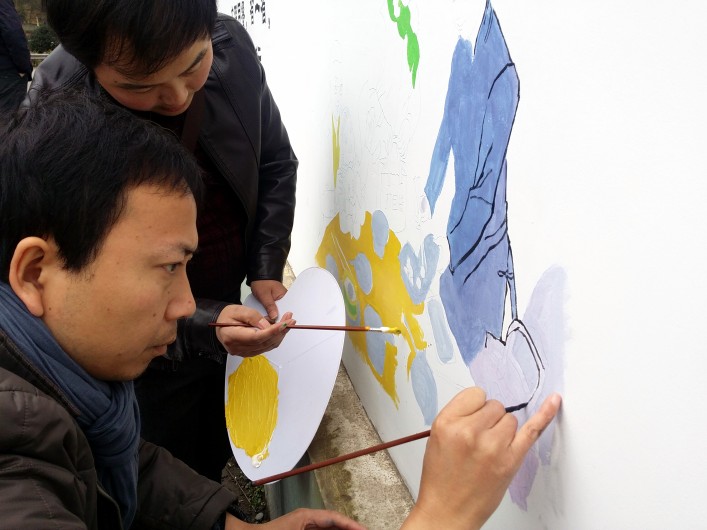 村民們在墻上創(chuàng)作社會主義核心價值觀主題的手繪作品