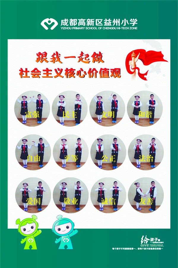“小朋友,你知道社會主義核心價值觀嗎?”“知道呀,自由是這樣的。”昨日下午,高新區(qū)益州小學二年級(1)班的初甜甜張開雙臂,像鳥兒揮動翅膀一樣擺動著自己的雙手,表示二十四字中的“自由”。