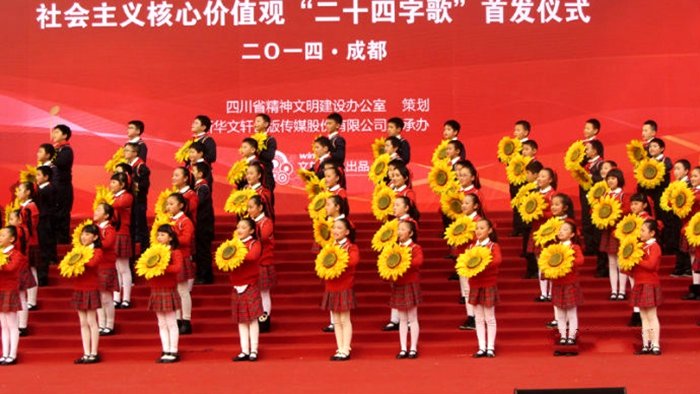 “富強、民主、文明、和諧,從中國到世界……”在成都的大街小巷經常能聽到這樣一首優(yōu)美明快的歌。這首《世紀的約定——社會主義核心價值觀“二十四字歌”》于去年12月31日在成都首發(fā)。一年時間,社區(qū)居民、學校孩子、機關企事業(yè)單位職工等紛紛學唱傳唱,現(xiàn)已風靡成都。