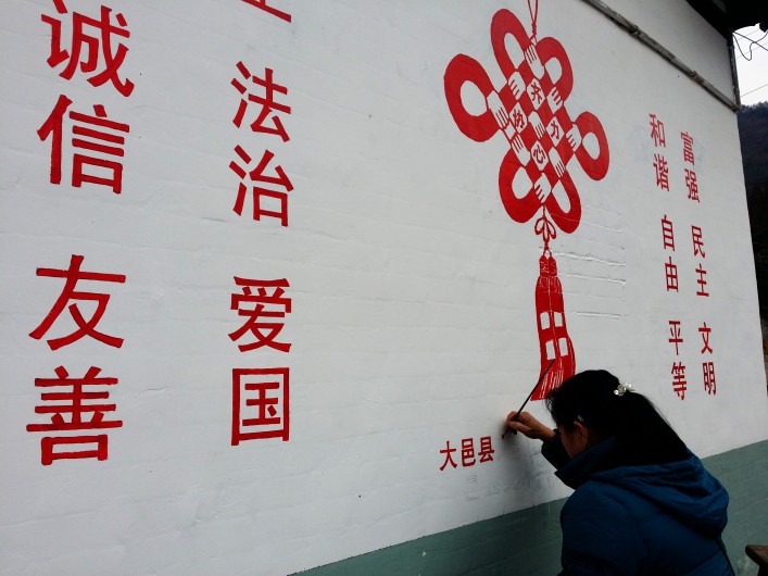 今年10月底,家住大邑縣潘家街的劉阿姨發(fā)現(xiàn)家附近的街道變得越來越漂亮 :多出了一條主題街區(qū)!原來,這是大邑縣政府打造的全縣首個社會主義核心價值觀主題街區(qū),整個主題街區(qū)由63幅墻面畫組成,包括中國夢、愛黨愛國、傳統(tǒng)美德、道德模范、廉政建設 、依法治國等6大主題,其中《世紀的約定》曲譜和歌詞,也被搬到了墻上。