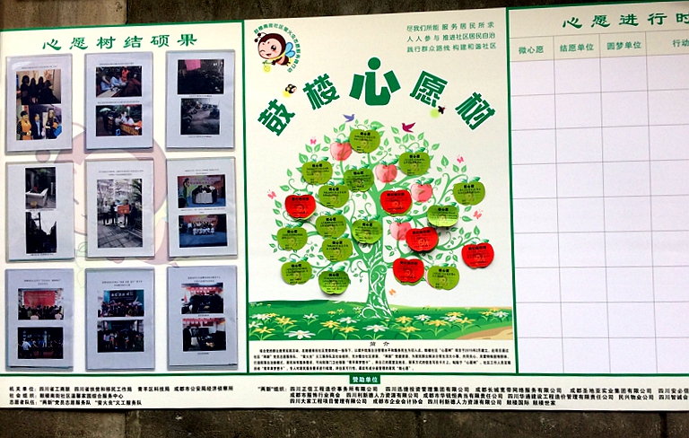 據(jù)了解,“夢想樹”是成都市青羊區(qū)鼓樓南街社區(qū)“微心愿+螢火蟲服務(wù)”的黨員志愿服務(wù)新模式的重要部分。“夢想樹”也稱“心愿樹”,成都市青羊區(qū)鼓樓南街社區(qū)通過在轄區(qū)院落設(shè)置“心愿樹”,收集居民“微心愿”,解決居民實(shí)際需求。居民如有服務(wù)需求,可向院落門衛(wèi)處領(lǐng)取“青蘋果夢想卡”,將自己的愿望及姓名、聯(lián)系方式的信息寫在卡片上,粘貼于“心愿樹”。社區(qū)工作人員定期回收“青蘋果心愿卡”,對居民服務(wù)需求進(jìn)行梳理,并調(diào)查評估其可行性,最后形成分級管理的居民“微心愿”。