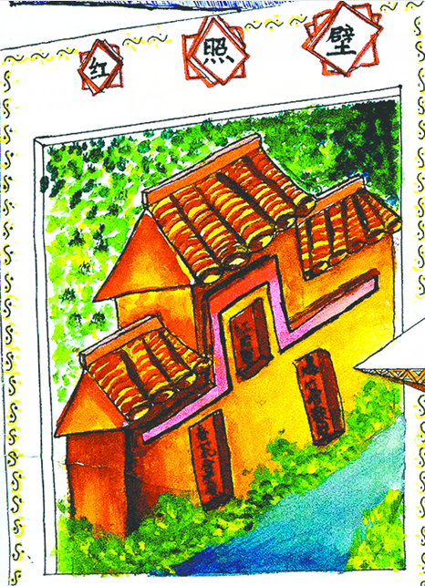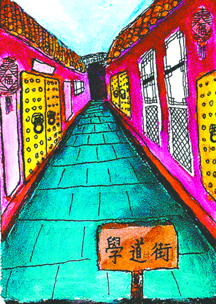 此次學生報的雛形,源于學校一面墻上的地圖照片。幾個孩子將地圖勾畫到了學生報上,用紅墻、瓦屋、拱門,將學校周邊的學道街、紅照壁、督院街等古街或點位一一勾畫出來。