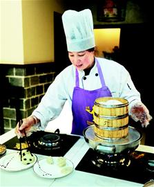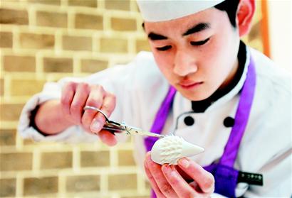經(jīng)過約20分鐘的發(fā)酵,用來制作饅頭的面團就準備好了。開始造型了,只見面團在大廚的手中捏來捏去,不一會成了熊貓、刺猬、兔子、玫瑰、荷葉……尤其是制作熊貓和刺猬饅頭的過程,吸引了很多人的目光:大廚先揪一坨面揉成球狀,再沾上五顆黑豆,分別作熊貓的耳朵、眼睛和嘴,不一會兒,一個圓乎乎的熊貓頭就出來了;大廚又將一塊面團在手里揉了揉,捏成水滴狀,再用剪刀在面團上一排排地剪出小刺,最后沾上兩粒黑芝麻,一只渾身尖刺的小眼睛刺猬就誕生了。
