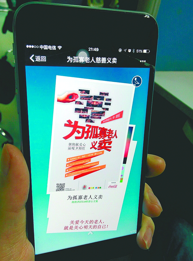 原來,一次活動中,同學(xué)們接觸到了學(xué)校附近社區(qū)的孤寡老人,家長們一合計(jì),決定做一次“為孤寡老人義賣”活動。孩子們提供想法、家長們操刀制作的微信“義賣城”頁面很快上線。為讓物品熱賣,孩子們在“宣傳”上絞盡腦汁?!拔曳喠苏f明書,還在網(wǎng)上查閱了資料?!迸馁u平板電腦的桂天愛做足功課,將參數(shù)詳盡羅列,并配上“方便、時(shí)尚、速度快,容量還大”的廣告語,她的電腦最終成功拍得800元。