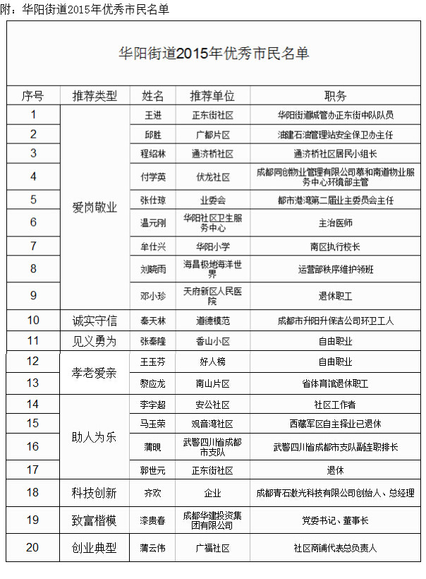 自2015年9月下旬以來,由成都天府新區(qū)科技發(fā)展和宣傳策劃局、華陽街道黨工委辦事處主辦,成都文明網(wǎng)、成都全搜索新聞網(wǎng)協(xié)辦的華陽“優(yōu)秀市民”評選活動一經(jīng)發(fā)起就引發(fā)了熱烈的反響。通過在華陽各車站、商場、景點以及社區(qū)、院落等地的廣泛宣傳,華陽多個社區(qū)、單位、學(xué)校及廣大市民的踴躍參與,在短短2個月的時間里,主辦方就收到了超過300個華陽“優(yōu)秀市民”的提名。經(jīng)過初次篩選,100名參選人進(jìn)入投票環(huán)節(jié)。市民們在15天的投票期內(nèi)通過網(wǎng)站和微信兩種方式為候選人投票,后經(jīng)審核和公示,20位參選人當(dāng)選首屆華陽“優(yōu)秀市民”。