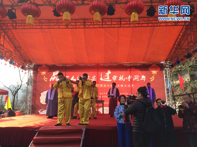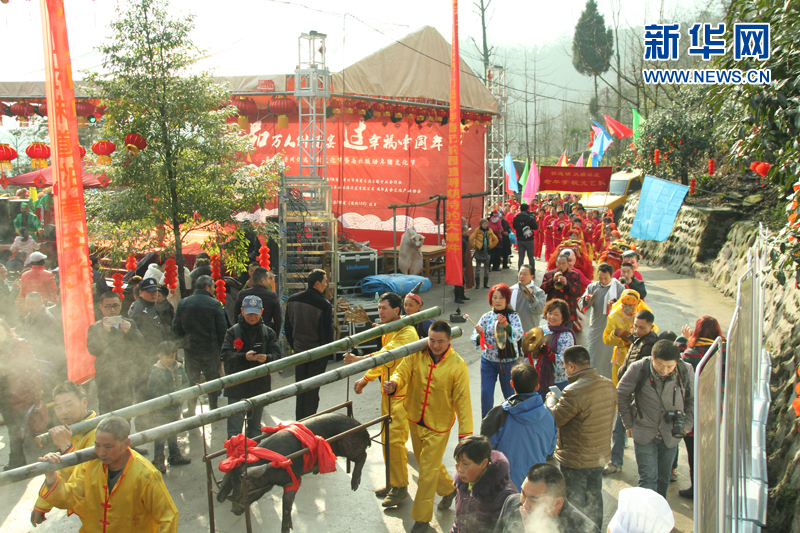活動在大屏幕播放近四年來懷遠鎮(zhèn)富強村開展“我們養(yǎng)豬吧”活動發(fā)生的變化中拉開帷幕,河北石家莊同時聯(lián)動開展的年豬文化節(jié)現(xiàn)場畫面同期切換。在熱烈的鞭炮聲中,“主祭人”宣讀祭文,帶領祭祀人員按傳統(tǒng)習俗開始祭祀,祈求來年六畜興旺,百姓生活和諧富足,并現(xiàn)場進行了“皰丁解‘豬’”和“一刀準”PK賽。來自崇州當?shù)睾屯馐∵x手們輪番上陣,用精彩的表現(xiàn)贏得了全場陣陣喝彩。在活動現(xiàn)場,還同期舉行了為富強村殘疾人、低保戶等特困群眾進行了送溫暖、崇州當?shù)貢颐赓M向群眾送春聯(lián)、老年大學秧歌隊民俗大巡游、千人游茶馬古道、免費喝刨湯和山貨交易會等活動。