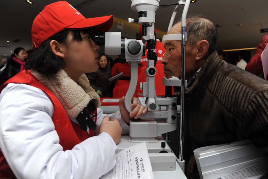 志愿者現(xiàn)場(chǎng)為市民檢查眼睛