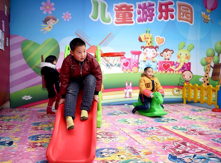 幾名小旅客在成都火車站春運(yùn)臨時(shí)候車廳的兒童活動區(qū)玩耍。
