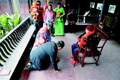22日,在成都市龍泉驛區(qū)洛帶鎮(zhèn)江西會(huì)館,迎來了溫暖人心的一幕——72歲的的兒子龐明忠攜妻兒老小四代人,逐一向101歲的母親行跪拜禮,給老母親拜年送祝福。