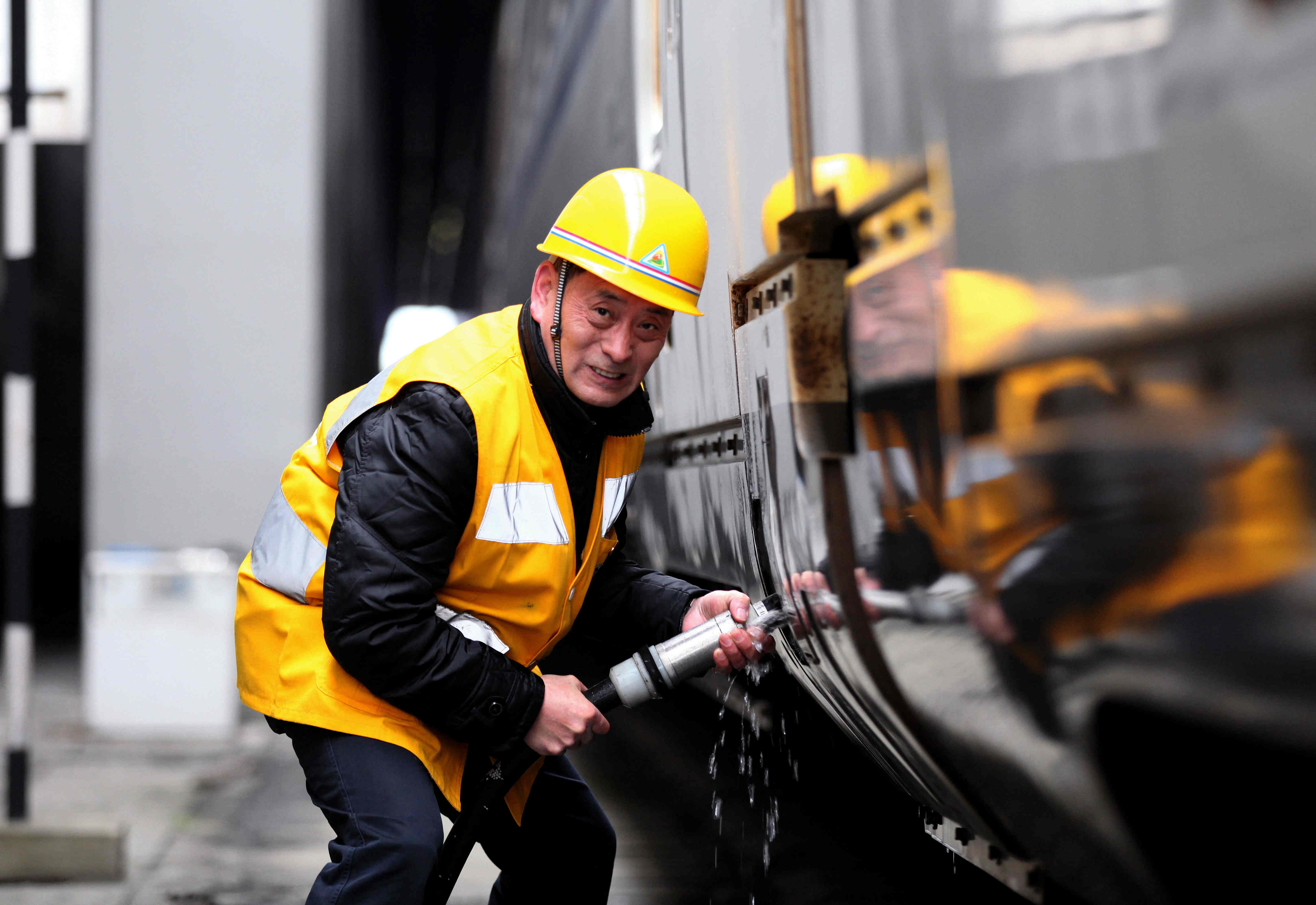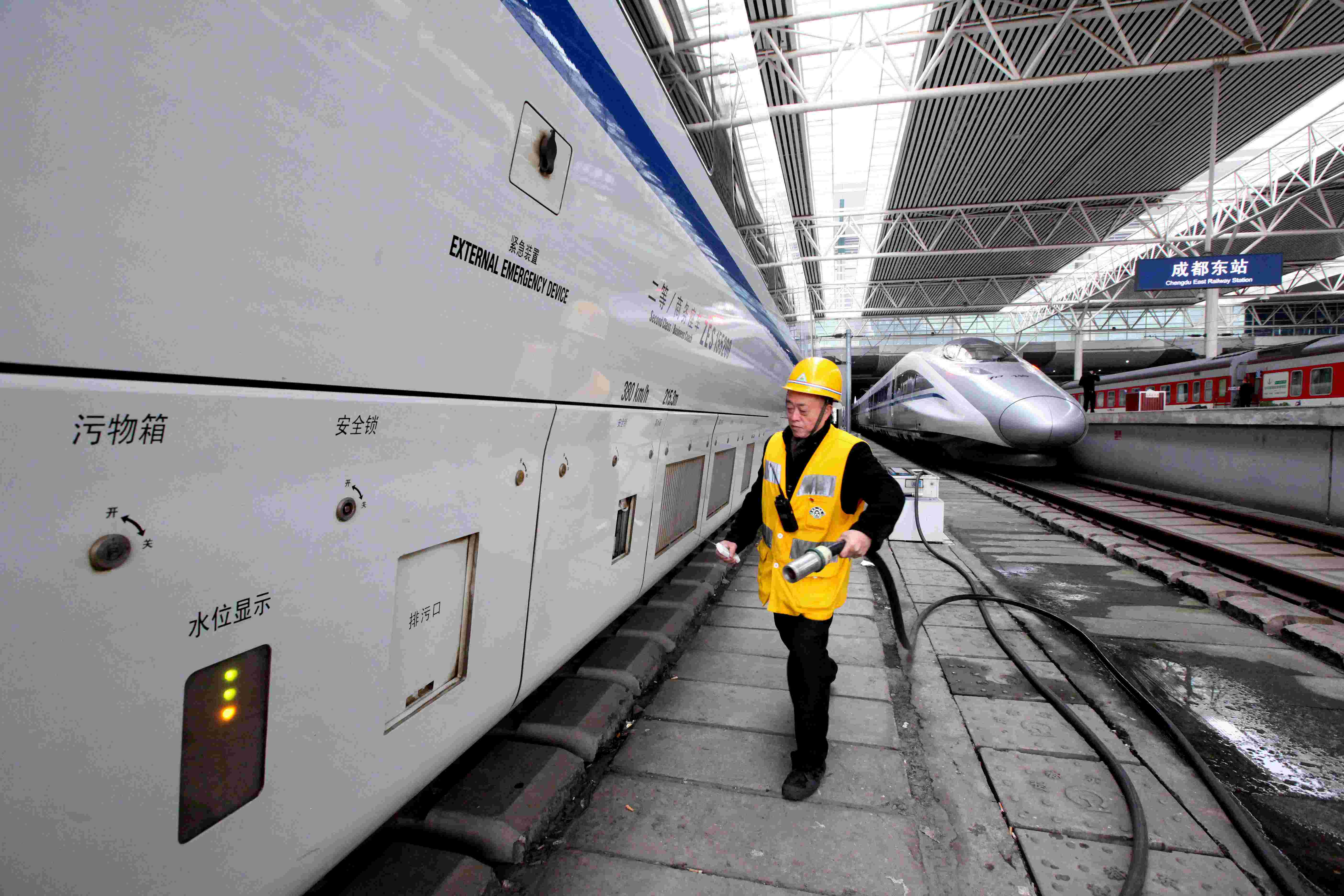 1月26日,成都東站服務(wù)旅客臨時(shí)黨支部黨員上水工劉六太正在為“和諧號(hào)”動(dòng)車組上水。