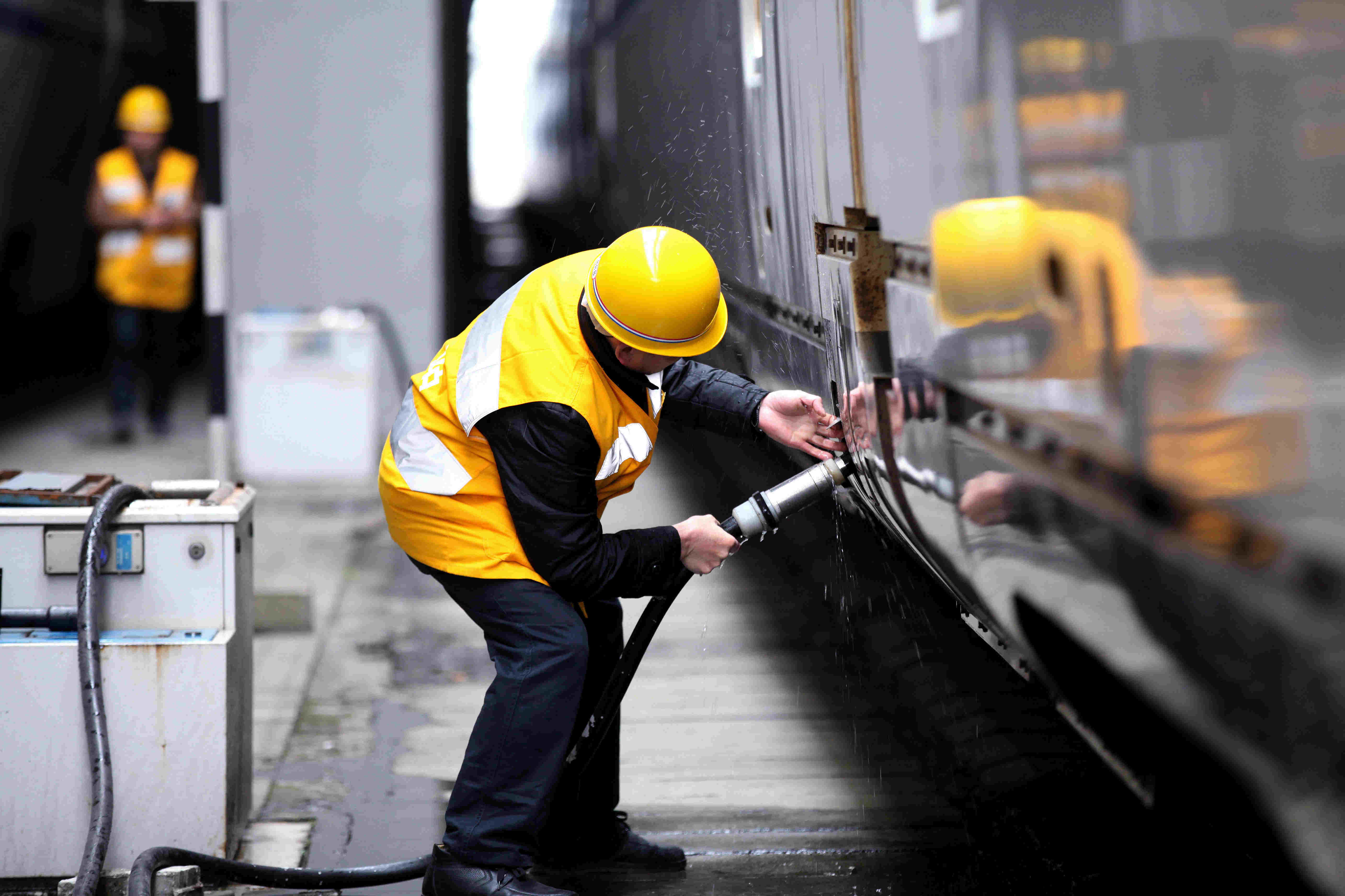 成都東站服務(wù)旅客臨時(shí)黨支部黨員上水工董光榮正在為“和諧號(hào)”動(dòng)車組上水。