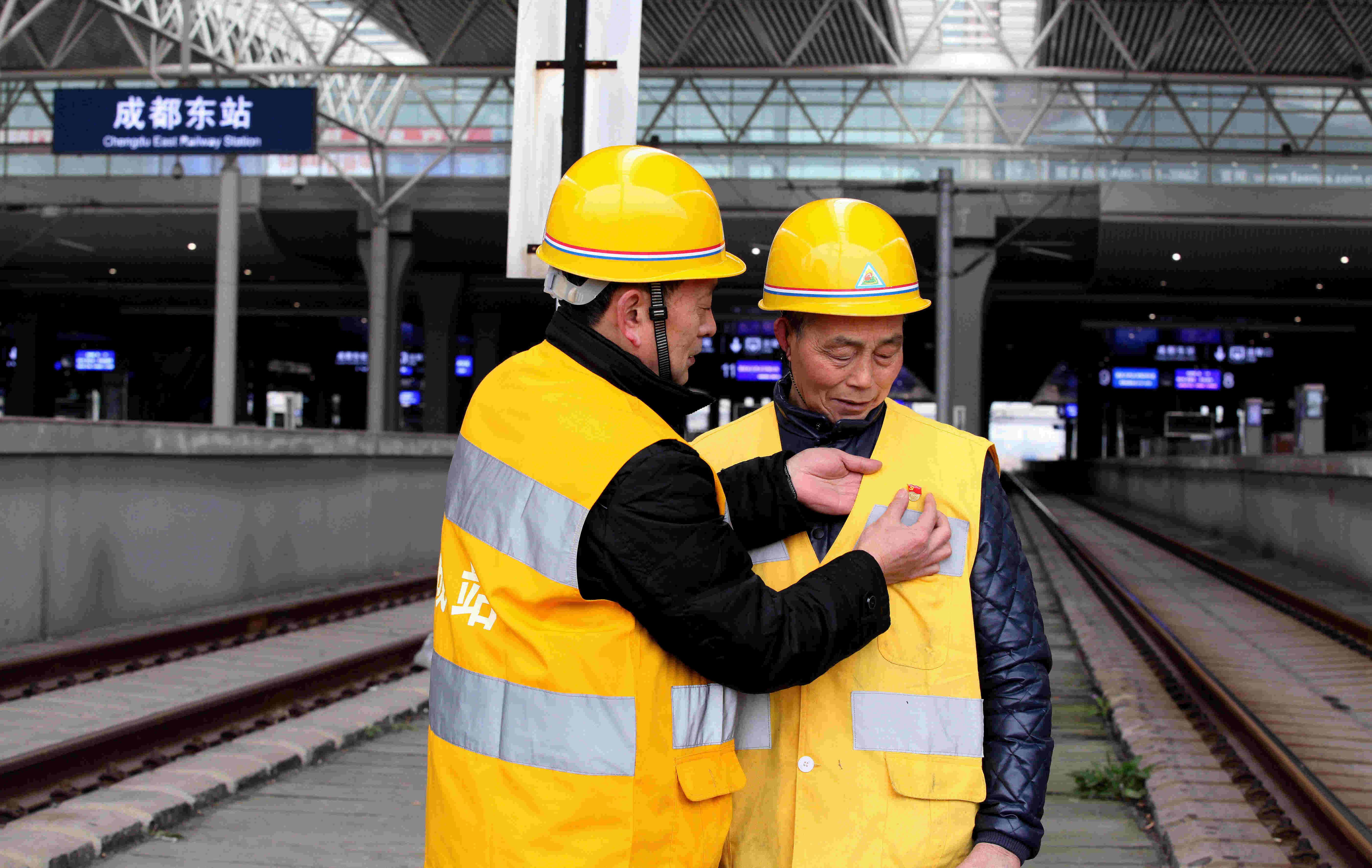 在成都東站,有一個(gè)服務(wù)旅客的臨時(shí)黨支部,他們是由車站協(xié)警隊(duì)員、保潔人員、站內(nèi)商家等8名黨員組成的“大齡志愿者”。他們給列車上水、給乘客送餐,用自己的行動(dòng),保障旅客安全、方便、溫馨出行。