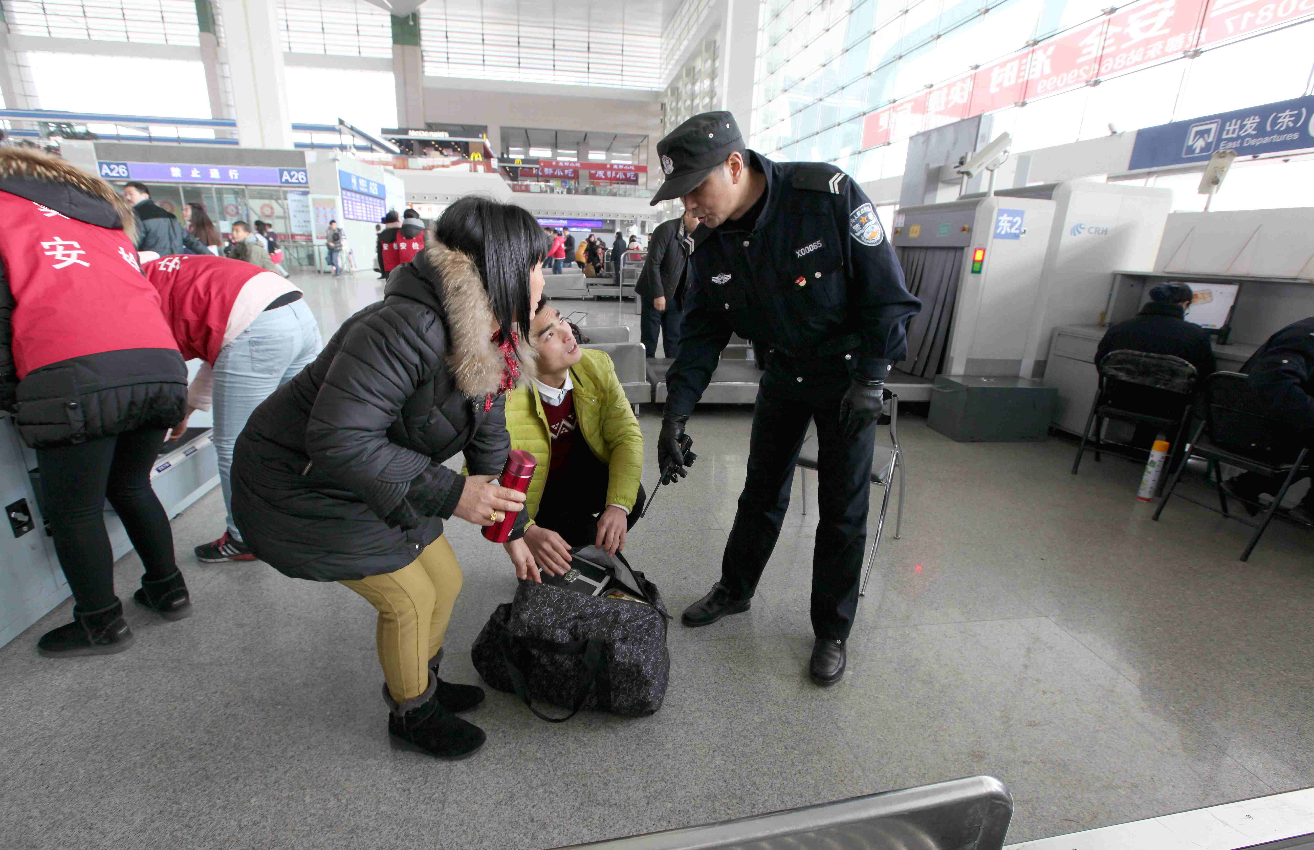 成都東站志愿者協(xié)警田園正在對(duì)旅客行李進(jìn)行開包檢查。