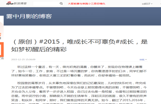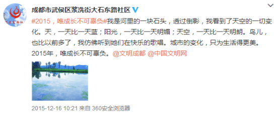 新浪微話題自2015年12月20日開設以來,吸引全市網友紛紛訴說著自己或身邊人、身邊事的發(fā)展變化。而有的網友還腦洞大開,把自己當作是路邊一棵樹、一粒沙,然后以第一人稱的角度和語氣,來和大家分享可這一年自己的所見所聞、成長感悟。截至目前,新浪微話題閱讀量達4.5萬,700余名網友參與話題互動,在互聯網上營造出了積極向上、充滿正能量的輿論氛圍。