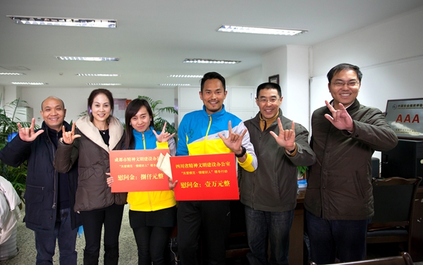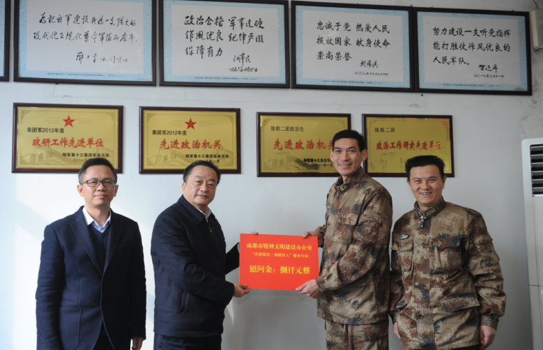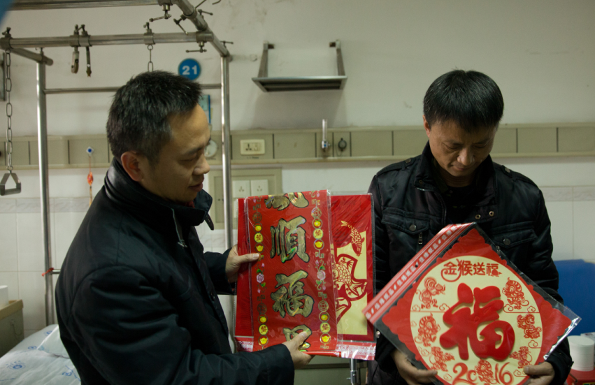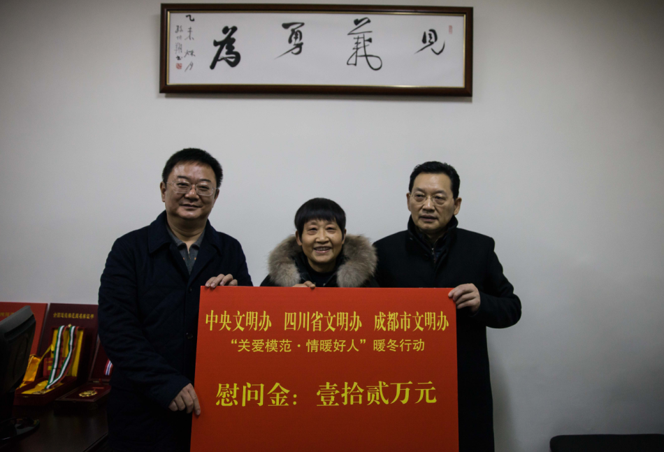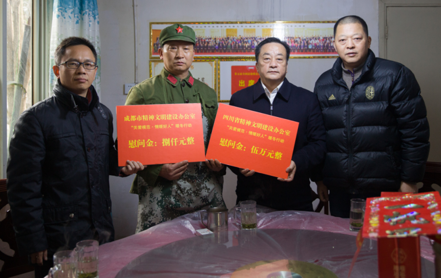 成都市文明辦志愿服務(wù)處處長(zhǎng)黃東為第四屆四川省道德模范劉軍送上節(jié)日慰問(wèn)金和春聯(lián)
