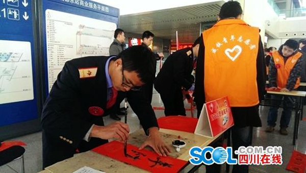 “有困難,找黃馬夾(志愿者)”在候車大廳,隨處可見穿著黃色馬夾志愿者的身影。回家過年,不妨帶上一副春聯(lián),志愿者現(xiàn)場揮毫,為歸家的旅客送上新年祝福;醫(yī)療組的志愿者也準(zhǔn)備就緒,“一旦旅客有什么不適,就可第一時(shí)間找到我們?!敝驹刚咄鯊?qiáng)說。