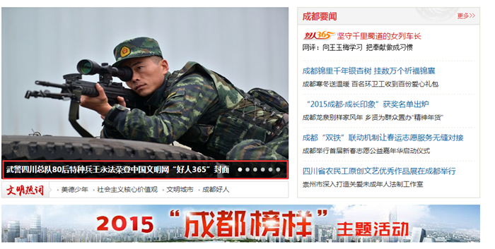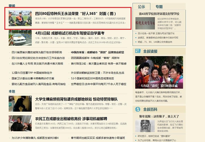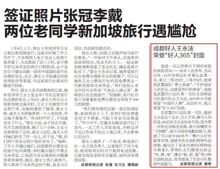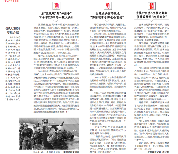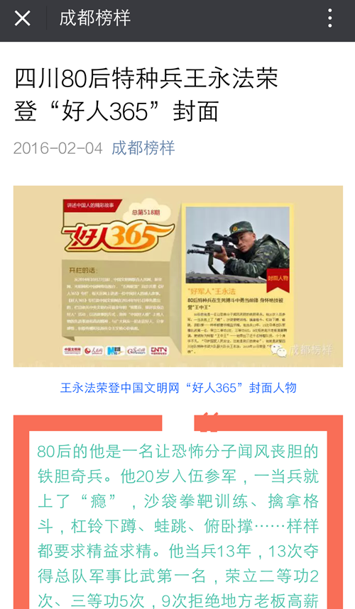 80后的他是一名讓恐怖分子聞風(fēng)喪膽的鐵膽奇兵。他當(dāng)兵13年,13次奪得總隊(duì)軍事比武第一名,榮立二等功2次、三等功5次,他帶出了近千名特警隊(duì)員,個(gè)個(gè)身手不凡?!笆刈o(hù)國家人民安全,這就是我們的使命”,他就是武警四川總隊(duì)特種作戰(zhàn)大隊(duì)副大隊(duì)長王永法,2015年10月榮登“中國好人榜”。 2016年2月4日,王永法榮登中國文明網(wǎng)“好人365”專欄封面人物,成都全媒體對此進(jìn)行了重點(diǎn)報(bào)道。“作為一個(gè)軍人,他不僅有過硬的軍事素質(zhì),更有一顆忠誠愛國之心。在世界舞臺上,他用本事和意志向全世界展現(xiàn)了中國特種兵的風(fēng)貌,無愧為‘王中王’”。中國文明網(wǎng)這樣評價(jià)。