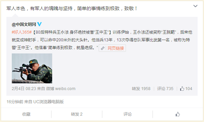 “把簡單練到極致,就是絕招!”。從“王脫靶”到“神射手”,王永法日復(fù)一日年復(fù)一年的刻苦訓(xùn)練完成了“王中王”的華麗蛻變,他把維護(hù)國家榮譽(yù)、守衛(wèi)人民生命視為己任,哪怕迎著子彈,他也奮勇前進(jìn),是當(dāng)之無愧的“兵王之王”!