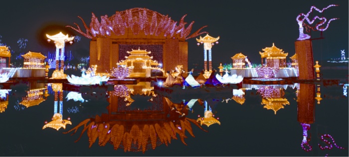 位于三圣花鄉(xiāng)七彩田野的熊貓燈會(huì),每天有三場(chǎng)文藝表演,將經(jīng)典民俗與現(xiàn)代動(dòng)感等元素和諧融入在一起。而水上燈組《雕龍鼓》《熒光水鼓舞》集聲、光、水、景為一體,激昂的樂(lè)曲、鼓舞的節(jié)奏、激情四濺的水花、優(yōu)美的舞姿,結(jié)合魅力無(wú)限的現(xiàn)代舞臺(tái)燈光效果,演繹出燦爛振奮的舞風(fēng)和古韻,給市民帶來(lái)了目不暇接的視覺(jué)沖擊和審美享受。