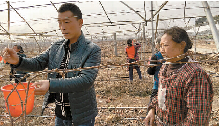 談起葡萄,何中富便打開了話匣子,儼然一個葡萄專家。可說起當初走過的彎路,他也是感慨萬分。由于缺乏經(jīng)驗,導(dǎo)致紅提幼苗出現(xiàn)大面積生病腐根現(xiàn)象,第一年就虧損30余萬元。但這沒有讓他心灰意冷,反而讓他堅定了認真學習葡萄種植技術(shù)和管理的決心。他迅速進行補植并精心管理,第二年紅提幼苗長勢喜人,眼看就要豐收,卻再次遭遇不測,由于排水系統(tǒng)不暢,一場突如其來的大暴雨將紅提基地淹沒。創(chuàng)業(yè)路上第二次受到重創(chuàng),何中富還是選擇繼續(xù)奮斗,將房屋抵押貸款的68萬元,再次投入到基地中。這一次有了前期的經(jīng)驗,終于在2013年首次迎來了紅提豐收,且葡萄的品質(zhì)格外好,得到了客商們的一致追捧。當年,前期的投資全部收回,他的信心更足了,帶動村民們共同致富的信念也更堅定了。