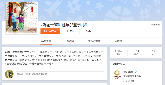 此外,成都文明網(wǎng)還邀請(qǐng)廣大網(wǎng)友參與新浪微話題討論,截至目前,該話題閱讀量已達(dá)11.8萬,1600余名網(wǎng)友自主參與互動(dòng)。