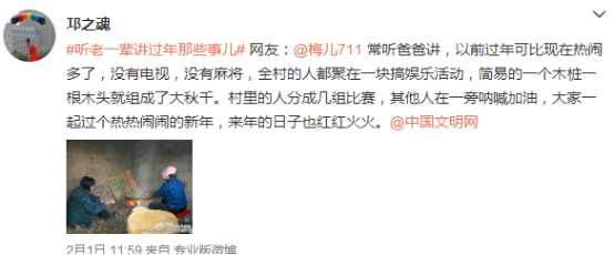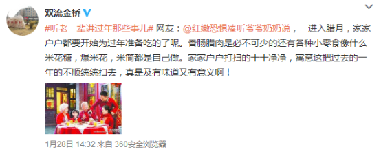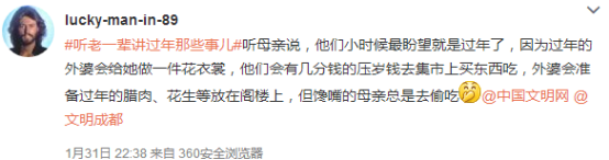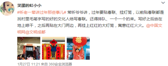 “二十三糖瓜粘,二十四掃房日,二十五做豆腐,二十六去割肉,二十七宰年雞,二十八把面發(fā),二十九蒸饅頭,三十晚上熬一宵,大年初一去拜年 ?!比绱酥v究的過年,你知道嗎?為讓更多人了解過年傳統(tǒng)習(xí)俗,了解過年背后所承載的文化意義,成都文明網(wǎng)于年前開展了“聽老一輩講過年那些事兒”網(wǎng)絡(luò)文明傳播活動(dòng),邀請(qǐng)全市網(wǎng)友傾聽老一輩所知曉的、經(jīng)歷的過年那些事兒,再通過發(fā)布微博、撰寫博文、回復(fù)貼文等形式和大家一起分享,讓更多年輕一輩在感嘆嗟吁之余加強(qiáng)對(duì)傳統(tǒng)節(jié)日、傳統(tǒng)習(xí)俗的重視和堅(jiān)持,讓中華民族一年一度的狂歡節(jié)和永遠(yuǎn)的精神支柱能一直保持下去。