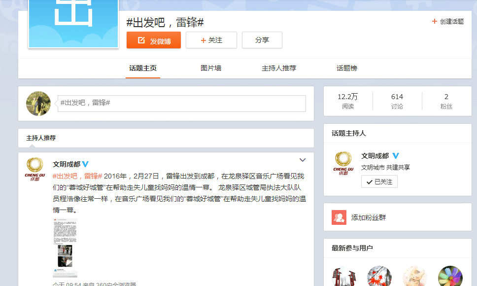 此外,成都文明網(wǎng)還發(fā)起“學(xué)雷鋒·做好8小時(shí)手上事”有獎?wù)魑摹?出發(fā)吧,雷鋒#微話題討論等雷鋒月主題網(wǎng)絡(luò)文明傳播活動,截至目前,活動帖點(diǎn)擊率已超3000余人次,微話題閱讀量達(dá)12.2萬人次,600多名網(wǎng)友參與討論。大家紛紛分享各地的“學(xué)雷鋒”志愿服務(wù)活動,有的免費(fèi)為居民量血壓、測血糖;有的為社區(qū)的老人和孩子們義務(wù)理發(fā);還有的到敬老院,為老人們煮湯圓,打掃衛(wèi)生……營造出全民“學(xué)習(xí)雷鋒 爭當(dāng)雷鋒 我是雷鋒”的良好輿論氛圍和向上向善的社會風(fēng)氣。