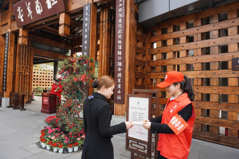 志愿者在杜甫草堂發(fā)放文明倡導(dǎo)書
