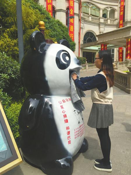 這些“熊貓”的大肚子上有自我介紹:成都市殘疾人福利基金會設(shè)立的公益設(shè)施,接受市民捐贈四季服裝、鞋子、包、帽子和書籍。