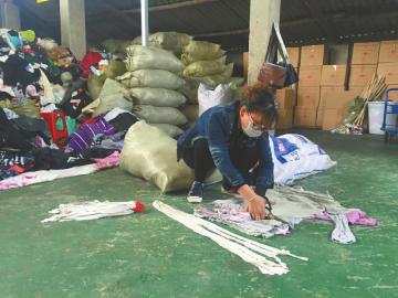 工作人員正在把部分不能捐贈的衣服制作成拖把。