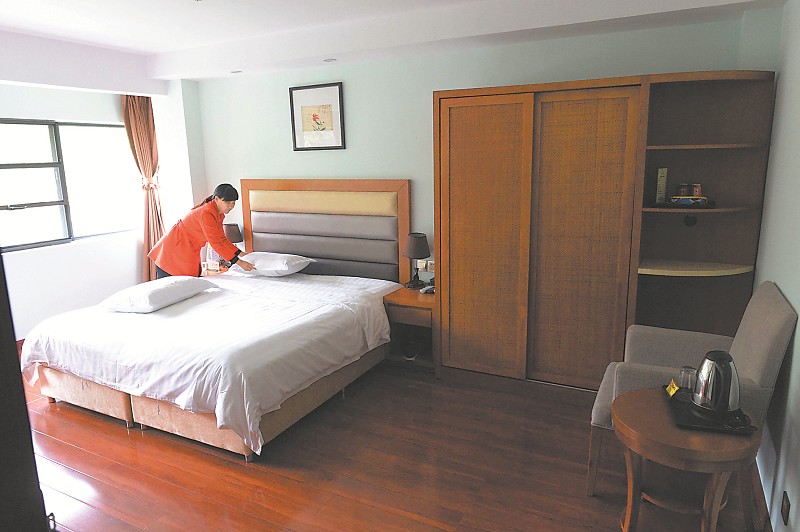 4月12日,在邛崍市夾關鎮(zhèn)周河扁新村一家庭酒店,農戶在客房里做內務。