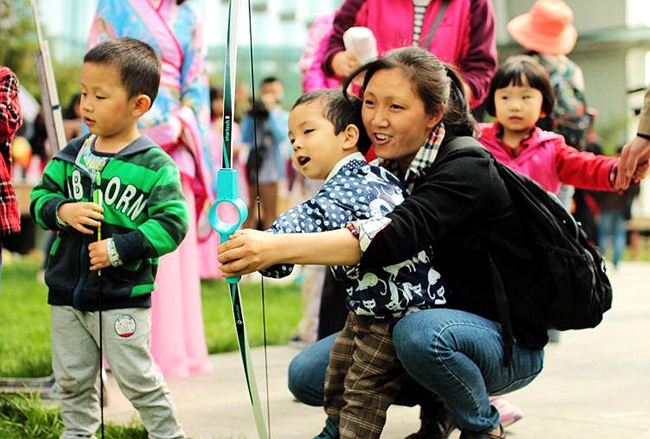 家長(zhǎng)帶孩子體驗(yàn)射箭項(xiàng)目。