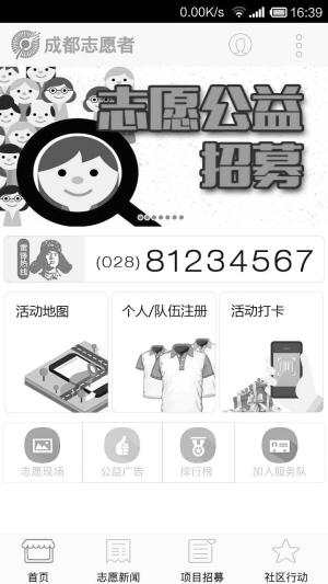 現(xiàn)在,全市在成都志愿者網(wǎng)上注冊(cè)的志愿者有150萬(wàn)人,實(shí)現(xiàn)了各區(qū)(市)縣全覆蓋,各地的志愿服務(wù)活動(dòng)都可以在成都志愿者網(wǎng)上找到蹤影。成都志愿者可以在手機(jī)上下載成都志愿者App,注冊(cè)登錄,活動(dòng)地圖上會(huì)以紅點(diǎn)的形式顯示正在開展的志愿服務(wù)項(xiàng)目,點(diǎn)擊進(jìn)入即可報(bào)名參加活動(dòng)。志愿者也可以通過(guò)用成都志愿者App掃描志愿服務(wù)活動(dòng)二維碼,記錄活動(dòng)內(nèi)容,累計(jì)志愿服務(wù)時(shí)間。