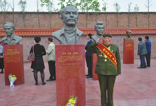 抗戰(zhàn)老兵張文輝老人向白求恩的雕像敬了一個莊重的軍禮,這個軍禮敬了足足兩分鐘。