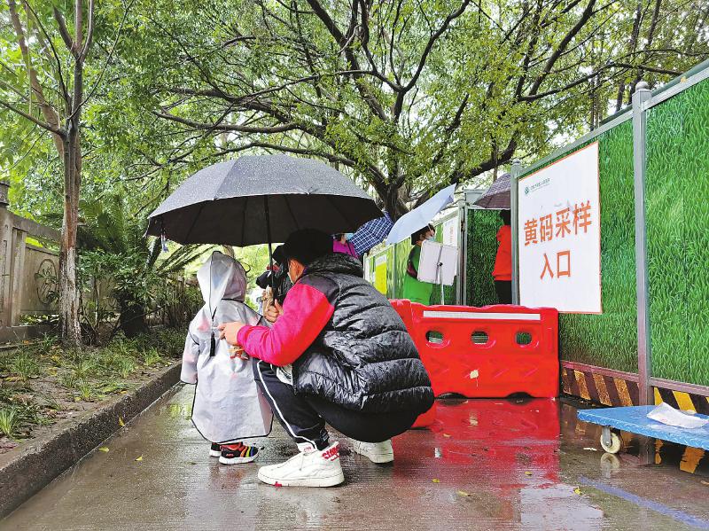 11月5日起,成都全市啟動(dòng)重點(diǎn)區(qū)域的部分核酸檢測(cè)及重點(diǎn)行業(yè)人員的抽檢。11月6日,成都下起了綿密的冬雨,一位帶著一歲多小寶寶的媽媽因健康碼變黃冒雨趕到成都市第五人民醫(yī)院做核酸檢測(cè)。孩子跟著進(jìn)入黃碼檢測(cè)區(qū)會(huì)不會(huì)徒增感染的風(fēng)險(xiǎn)?正當(dāng)年輕媽媽手足無(wú)措時(shí),醫(yī)院志愿者張茂昇及時(shí)出現(xiàn)在她身邊。志愿者撐著傘、蹲下身陪伴小寶寶的畫(huà)面溫暖了年輕母親,也溫暖著排隊(duì)等待檢測(cè)的市民。