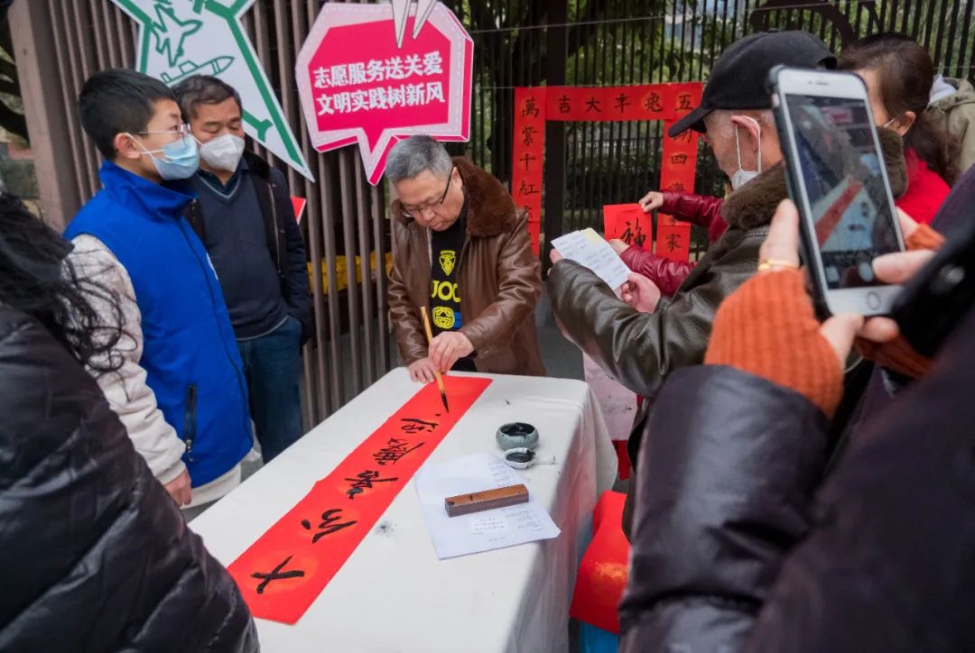 活動(dòng)現(xiàn)場(chǎng),筆墨紙硯一擺上,書法大家和小書法志愿者們執(zhí)筆上陣,吸引了一大批市民駐足觀賞?!拔拿骰ㄩ_(kāi)新時(shí)代,玉兔迎春步步高”“—年四季春常在,萬(wàn)紫千紅花永開(kāi)”“ 大地春回江山聚秀,文明運(yùn)啟日月增輝”……紅幅鋪展、妙句成雙,書法志愿者們揮毫潑墨,一張張筆酣墨暢的“?!弊?,一幅幅意蘊(yùn)文明又吉祥的春聯(lián),蘊(yùn)含著大家的美好祝愿。市民們排隊(duì)領(lǐng)走了福字、春聯(lián),感受著濃濃的年味,每個(gè)人都喜在眉梢,現(xiàn)場(chǎng)一片歡樂(lè)祥和的氛圍。
