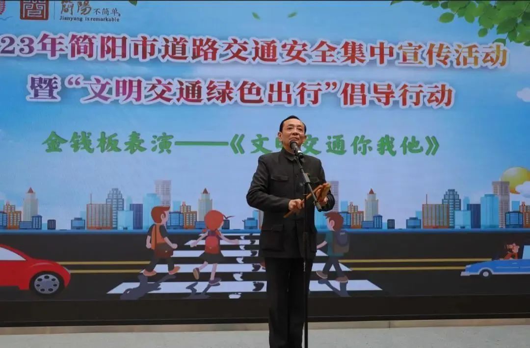 “騎車更要講規(guī)范,戴好頭盔才安全,自行車不搭人,千萬不要急超彎,扶身并行是莽漢,雙手離把車要翻……”在簡陽市道路交通安全集中宣傳活動暨“文明交通綠色出行”倡導(dǎo)行動現(xiàn)場,簡陽市非物質(zhì)文化遺產(chǎn)金錢板曲藝傳承人付勇太,用一段傳統(tǒng)金錢板說唱表演傳遞文明交通行為理念。