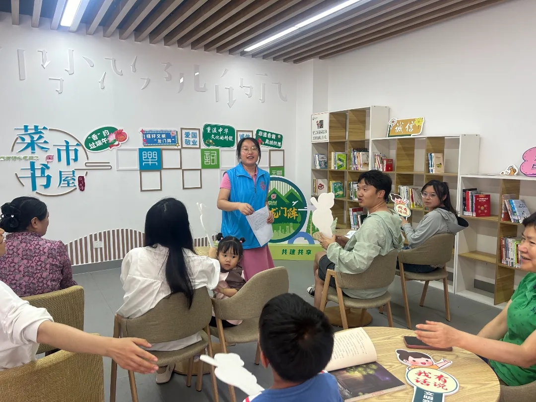 6月8日,“幸福安康·菜市過(guò)節(jié)——金牛區(qū)端午習(xí)俗故事分享會(huì)”分別在金牛區(qū)益民菜市新橋店菜市書(shū)屋和萬(wàn)裕菜市書(shū)屋開(kāi)展?!啊чT(mén)萬(wàn)戶(hù)懸菖艾,出城十里聞藥香’,掛艾草、插菖蒲是端午的習(xí)俗活動(dòng),艾草和菖蒲同時(shí)使用,可納福祛病?!崩蠋熡萌の兜姆绞浇o小朋友們講述了端午習(xí)俗及相關(guān)詩(shī)詞,手把手帶孩子們包粽子,讓孩子們對(duì)傳統(tǒng)節(jié)日有了更深的了解。