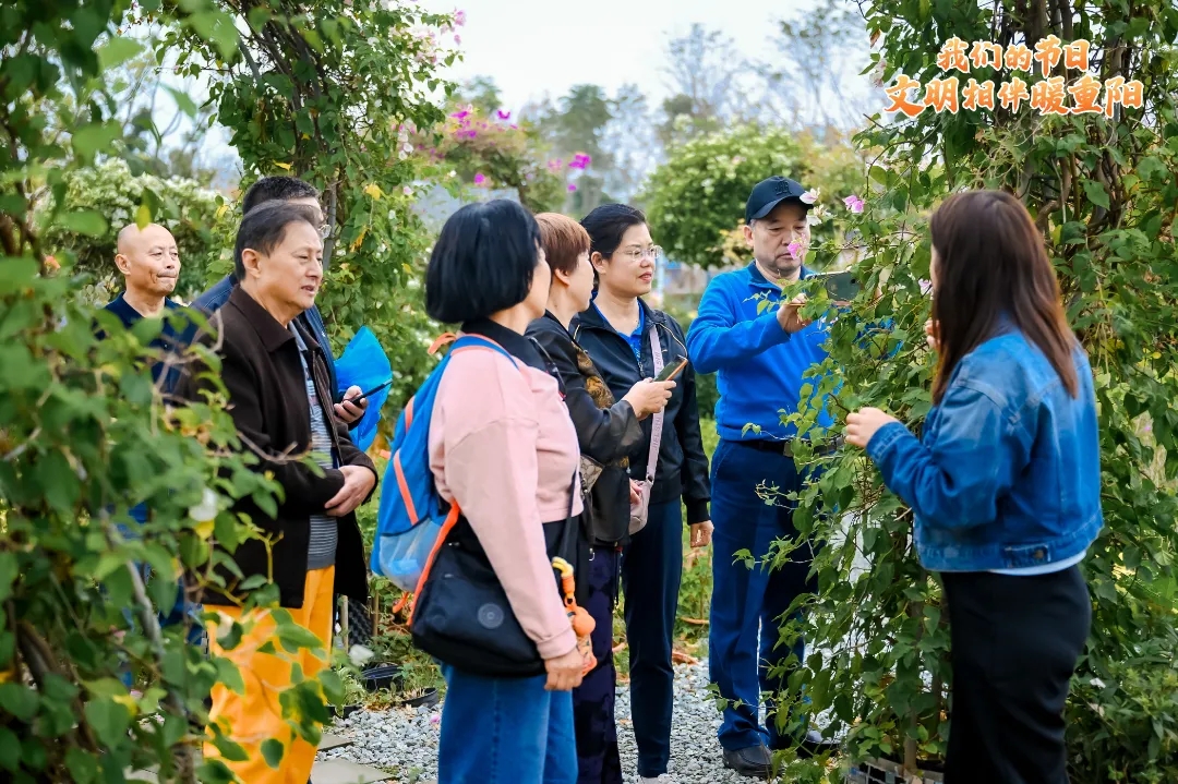 重陽節(jié)自古以來就有登高、賞秋等傳統(tǒng)習(xí)俗。當(dāng)日下午,20余位老人與工作人員一起前往世園會——金溫江博覽園,開啟了一場園藝賞秋之旅,感受和諧自然、生機(jī)盎然的生態(tài)之美?!拔医衲暌呀?jīng)72歲了,今天的賞秋游園儀式感滿滿,讓我覺得很充實,很幸福?!眳⒂^過程中,李爺爺笑著說。