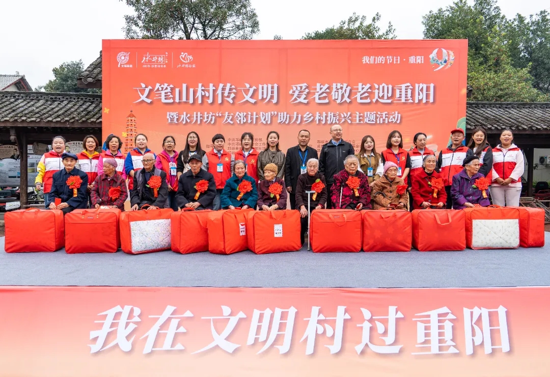 全國文明村鎮(zhèn)——邛崍市文筆山村表彰模范典型,為90歲以上的老人佩戴紅花,送上節(jié)日祝福。