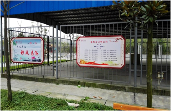 在“兩廊”等宣傳載體的設(shè)置上,充分考慮與環(huán)境的相容性,既注重氛圍效果,又不搞遍地開花,盡量利用小區(qū)現(xiàn)有設(shè)施進(jìn)行布置。如,把文明提示牌設(shè)計(jì)成扇形菱形等具有一定裝飾效果的圖形。又如,將民風(fēng)廊、文化廊建在休閑廣場沿線的非機(jī)動(dòng)車車棚棚體上。