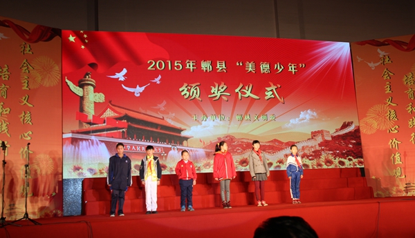 為充分展示和弘揚郫縣廣大未成年人以德修身、健康向上的精神風貌,不斷提升未成年人思想道德素質(zhì)。11月24日,縣文明辦在郫縣實驗學校隆重舉行2015 年“美德少年”表彰活動,對全縣51名獲得郫縣“美德少年”和6 名成都市“美德少年”進行了表彰。縣委、縣政府、縣人大、縣政協(xié)等“四大班子”領(lǐng)導和縣委宣傳部、縣文明辦等單位相關(guān)負責人,部分班級、校級美德少年代表和帶隊學校教師、有關(guān)學生家長近600人參加了此次活動。