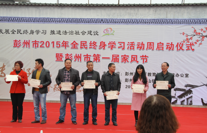11月3日,成都彭州市2015年全民終身學習活動周啟動儀式暨第一屆家風節(jié)活動在葛仙山鎮(zhèn)楠新社區(qū)隆重舉行。此次活動旨在倡導全民終身學習,傳承好家風,奉敬賢德人?;顒蝇F(xiàn)場舉行了好家風匯報表演,對“傳承文明家風,建設美麗彭州”系列活動中表現(xiàn)突出的80余個體、45余集體進行了表彰并頒發(fā)證書。最后,與會者紛紛走到“市民課堂”學習成果展示區(qū)觀看優(yōu)秀作品并積極參與其中,紛紛拿起剪刀與剪紙跟著老師的講解一步步剪下美麗的圖案,用十指展示好家風手指舞等。