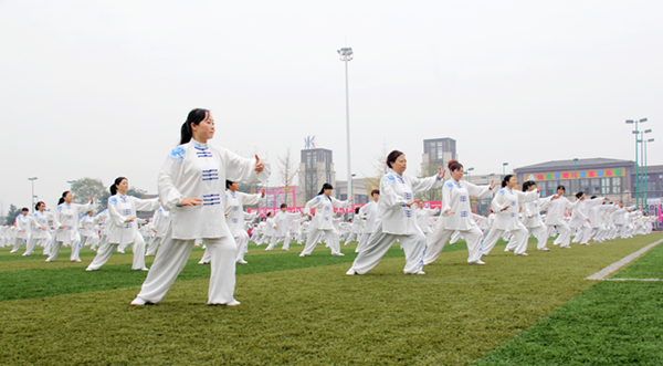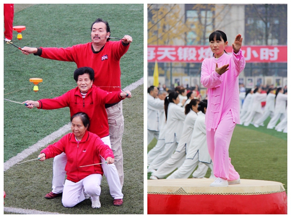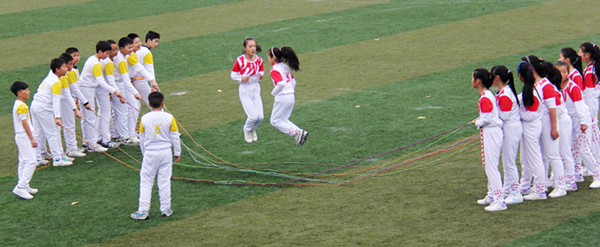 開幕式上,師生與社區(qū)居民一起進(jìn)行了精彩的全民健身特色運(yùn)動(dòng)項(xiàng)目展示。職業(yè)中學(xué)80名學(xué)生和520名社區(qū)居民一起進(jìn)行太極劍、太極拳展示,老中青三代同臺(tái)健身,和諧共舞;實(shí)驗(yàn)中學(xué)400名學(xué)生伴著歡快的音樂進(jìn)行三大球表演,一展高超球技;壽安中學(xué)360名學(xué)生帶來了青春活力的啦啦操和震撼的武術(shù)表演,健美、勁美、柔美渾然天成。由130名社區(qū)居民組成的健身隊(duì)將健身球操和抖空竹這兩種風(fēng)格迥異的健身形式結(jié)合在一起,令人耳目一新。西來學(xué)校、復(fù)興學(xué)校、松華學(xué)校、金鑰匙學(xué)校、北街小學(xué)、實(shí)驗(yàn)小學(xué)500余學(xué)生帶來的繩操、滾鐵環(huán)和滑輪表演將活動(dòng)推向高潮。