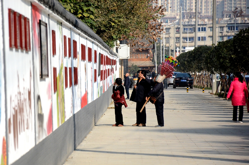 12月17日,十陵街道蜀王大道上,正在完善的十陵文化墻,成了街頭又一景。聚集墻前的人們,在這面150多米長的文化長廊上,欣賞著明蜀文化、客家文化、田園文化及十陵老舊記憶的縮影。