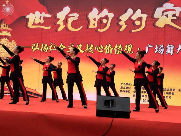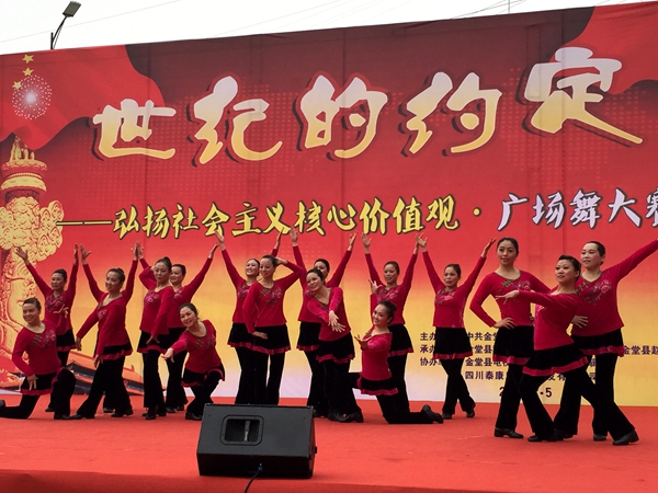 自“二十四字歌”推廣傳唱活動(dòng)開展以來(lái),金堂縣充分挖掘“二十四字歌”的文化內(nèi)涵,通過(guò)新舊媒體、道德講堂、法治講堂、孝善講堂、百姓故事會(huì)、主題班會(huì)等形式在校園、社區(qū)、公共場(chǎng)所、機(jī)關(guān)企事業(yè)單位積極組織開展《世紀(jì)的約定——社會(huì)主義核心價(jià)值觀“二十四字歌”》推廣傳唱活動(dòng),引領(lǐng)市民廣泛傳唱,營(yíng)造了濃厚社會(huì)氛圍。而將“二十四字歌”編排成廣場(chǎng)舞,成為了金堂縣傳唱推廣活動(dòng)的一大創(chuàng)新。1月5日,由縣委宣傳部主辦、縣文明辦、縣文旅局、趙鎮(zhèn)承辦的金堂縣踐行社會(huì)主義核心價(jià)值觀——“二十四字歌”廣場(chǎng)舞大賽火爆上演。