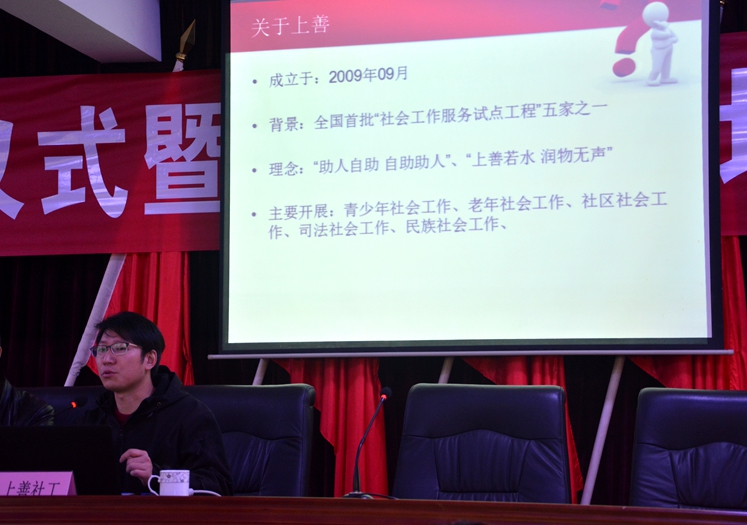 2016年1月8日,在彭州市天彭鎮(zhèn)的三社互動啟動儀式暨社工培訓(xùn)會上,上善社會工作服務(wù)中心正式入駐天彭鎮(zhèn),隨后上善社會工作服務(wù)中心將開展為期一年的以“助人自助、自助助人”和“上善若水 潤物無聲”為主題的志愿服務(wù)工作。