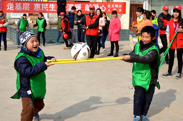 為成都市青白江區(qū)人和鄉(xiāng)南岳村的留守孩子送去了募集到的足球和新年禮物(有保溫水杯、書包、臺燈,還有寶寶霜),在活動中,青白江區(qū)義工聯(lián)合會專門為孩子們開展了用足球做道具的趣味活動,運送傷員、足球?qū)殹氨场?、百發(fā)百中讓孩子們玩得十分開心。伴著冬日的陽光、伴著志愿者們的熱情,村委會的壩子里歡聲笑語,其樂融融。