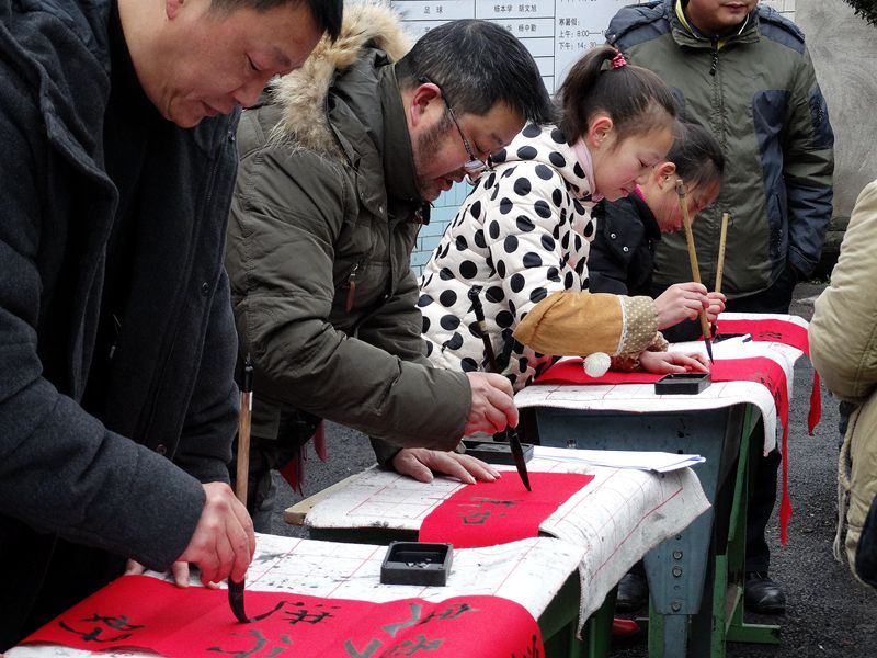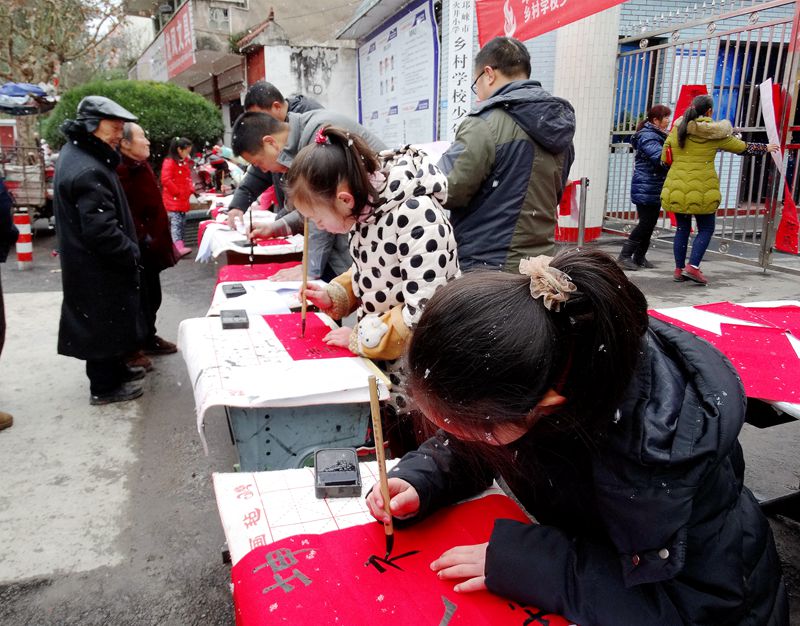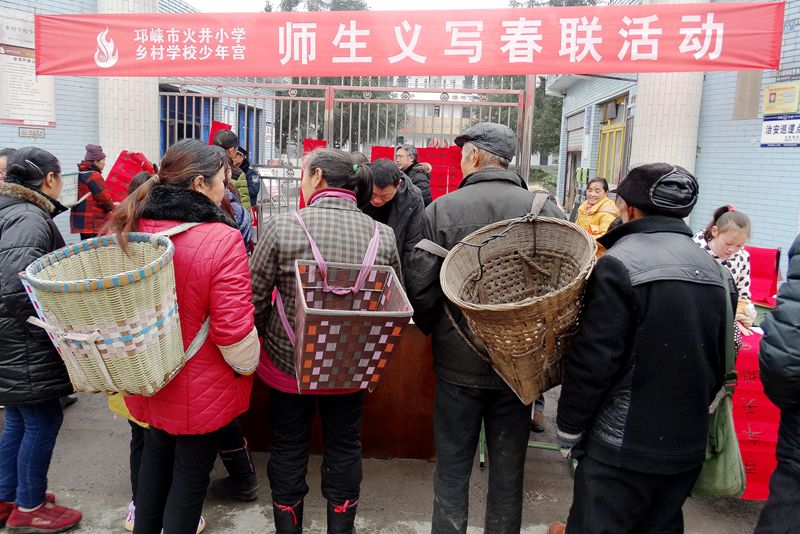 1月23日,入冬以來最冷的一天,天空飄起了久違的雪花;在邛崍市火井小學鄉(xiāng)村學校少年宮門口,高懸的橫幅烘托出一派熱鬧喜慶的氣氛。書法興趣小組的學員們在輔導員老師的帶領(lǐng)下,在校門口將早已準備好的“文房四寶”一字排開,又為火井的老百姓們免費寫起了春聯(lián)。一幅幅寓意吉祥祝福的春聯(lián)在大家手中誕生。轉(zhuǎn)眼間,校門口便擠滿了前來觀看的人們。他們時而踮起腳觀望,時而精心挑選,時而豎起大拇指贊嘆……居民們捧著這些墨跡未干的春聯(lián),眼神中流露出無比的幸福,整個活動現(xiàn)場呈現(xiàn)出一派歡樂和諧的氣氛。